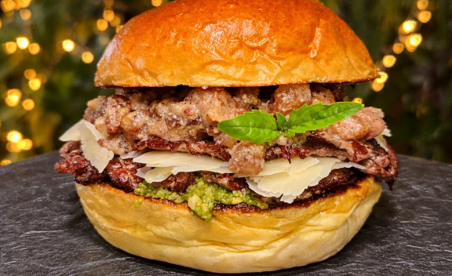 Dos smash de ternera vasca, pesto casero, queso parmesano, salsa carbonara y guanciale para una burger inspirada en la cocina italiana. Elige entre pan brioche, pan de cristal o pan sin gluten.